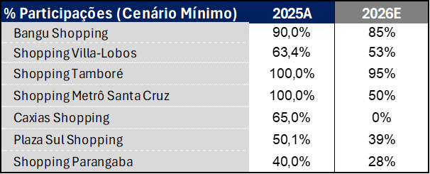 Alguns dos ativos selecionados estão entre os mais reconhecidos do portfólio, o que tende a facilitar o processo de emissão de cotas em parceria com a Kinea. Avaliamos a participação como estratégica, dado o histórico e expertise da gestora no mercado de Fundos Imobiliários (FIIs), especialmente considerando que a Kinea ainda não possui um fundo dedicado a shopping centers, o que reduz potenciais conflitos de interesse. Adicionalmente, a participação de 24% no fundo garante alinhamento de interesses com os cotistas. Estimamos que a eventual perda de receita operacional recorrente das vendas deve ser majoritariamente mitigada pelos ganhos com a venda dos ativos, pela receita de fees de gestão e pelo fluxo de dividendos, tornando a operação positiva do ponto de vista financeiro, especialmente considerando a forte geração de caixa da alienação.