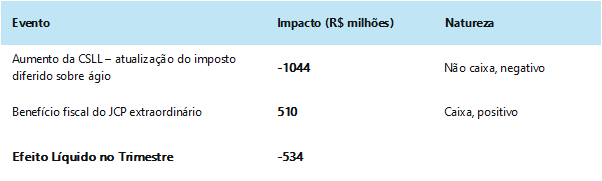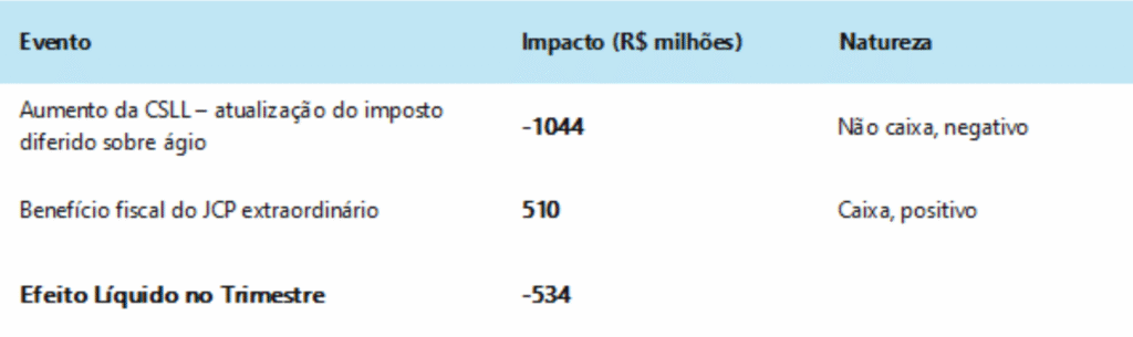 - Aumento da CSLL (Efeito Negativo Não Caixa): O incremento na alíquota da Contribuição Social sobre o Lucro Líquido gerou a necessidade de atualização do imposto diferido ativo relativo à amortização fiscal do ágio. Esse ajuste contábil extraordinário, de aproximadamente R$ 1,0 bilhão, não representa desembolso de caixa, mas impactou o resultado tributário do período.
