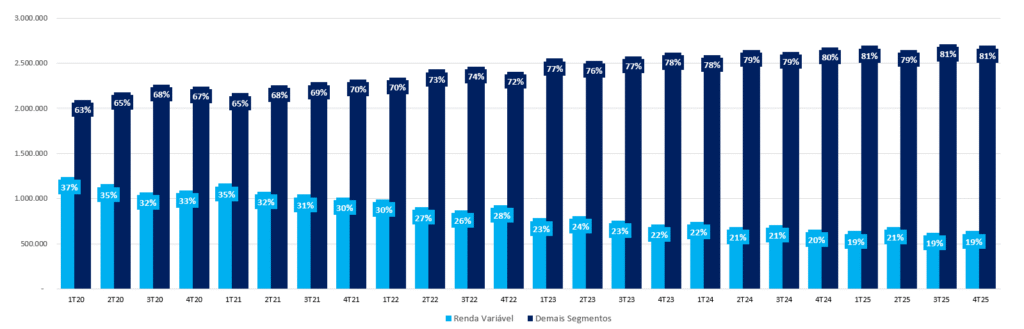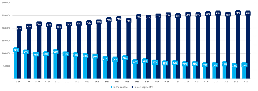 - Destaques: O crescimento foi puxado por ETFs, BDRs e Fundos Listados, que ganharam share no volume total.