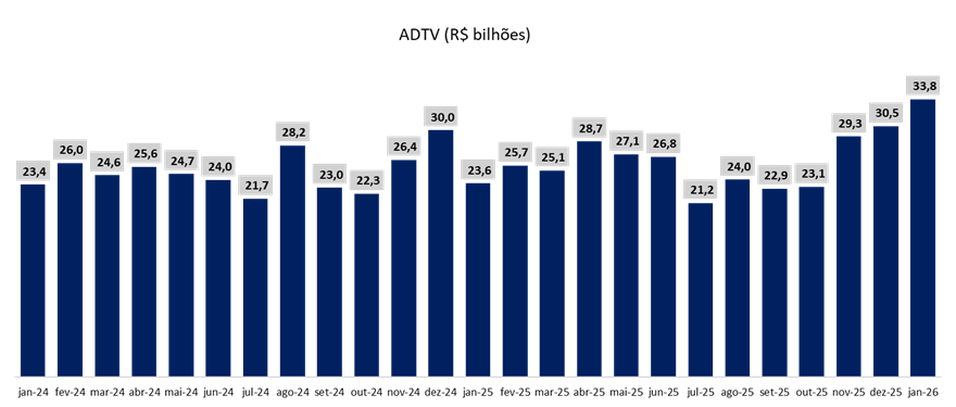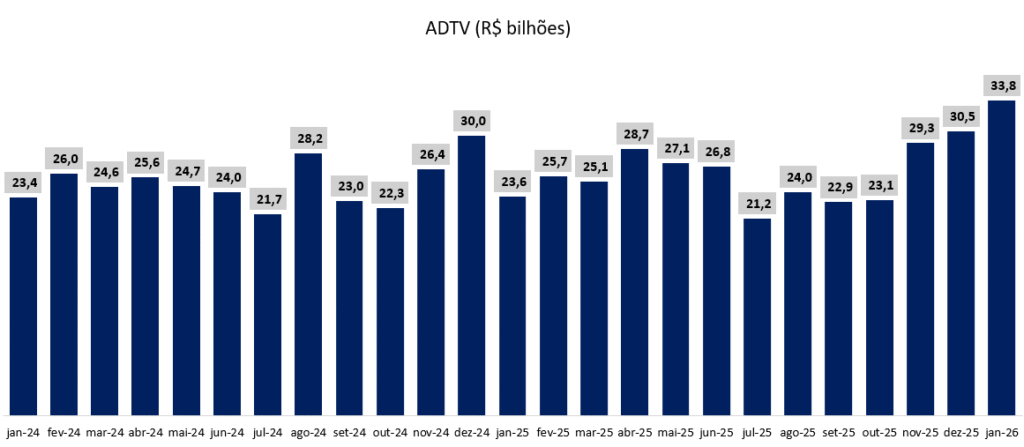 O início de 2026 tem mostrado forte aceleração do ADTV, impulsionado principalmente pelo fluxo estrangeiro. A combinação de fatores macroeconômicos e geopolíticos sugere que esse movimento pode se sustentar ao longo do ano: