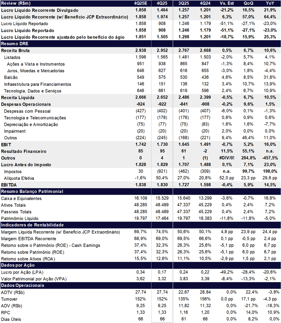 A B3 reportou lucro líquido ajustado de R$ 1,97 bilhão no 4T25, alta de +57,0% t/t e +64,4% a/a. O resultado veio +23% acima do consenso e +8% das nossas estimativas. O resultado foi impulsionado pelo expressivo benefício fiscal do JCP extraordinário (R$ 1,5 bilhão declarado), mas também por fundamentos sólidos: crescimento de receita de 10,6% a/a, controle rigoroso de despesas (+1,5% a/a) e resultado financeiro favorecido pelo CDI.