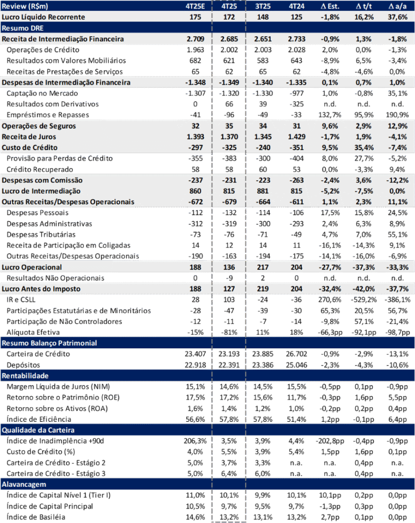O Banco BMG reportou lucro líquido recorrente de R$ 172 milhões no 4T25 (+16% t/t; +38% a/a), em linha com nossas estimativas. No entanto, o avanço foi integralmente sustentado por benefício tributário, enquanto a geração operacional piorou. O lucro antes de impostos (EBT) despencou -42% t/t e -38% a/a para R$ 127 milhões, ficando 32% abaixo de nossas expectativas (R$ 188 mi) e sinalizando deterioração sequencial na qualidade dos resultados.