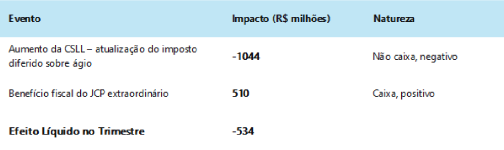 - Benefício tributário: Alíquota efetiva positiva de 81%, adicionou ~R$ 103 mi ao lucro líquido