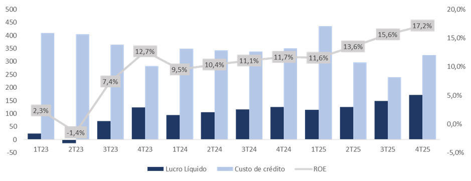 A rentabilidade (ROE) seguiu em trajetória de melhora, atingindo 17,2%, beneficiada pelos créditos fiscais, mas indicando evolução gradual na geração de retorno e aproximação ao custo de capital do banco.