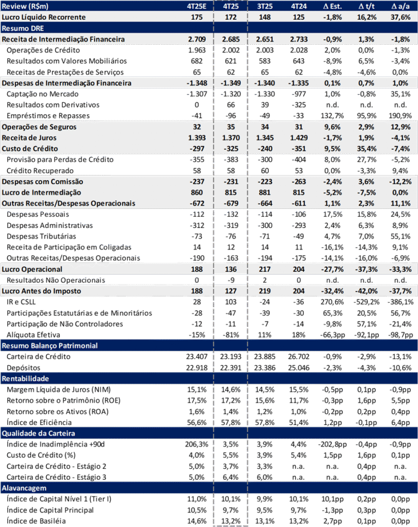 O Banco BMG reportou lucro líquido recorrente de R$ 172 milhões no 4T25 (+16% t/t; +38% a/a), em linha com nossas estimativas. No entanto, o avanço foi integralmente sustentado por benefício tributário, enquanto a geração operacional piorou. O lucro antes de impostos (EBT) despencou -42% t/t e -38% a/a para R$ 127 milhões, ficando 32% abaixo de nossas expectativas (R$ 188 mi) e sinalizando deterioração sequencial na qualidade dos resultados.