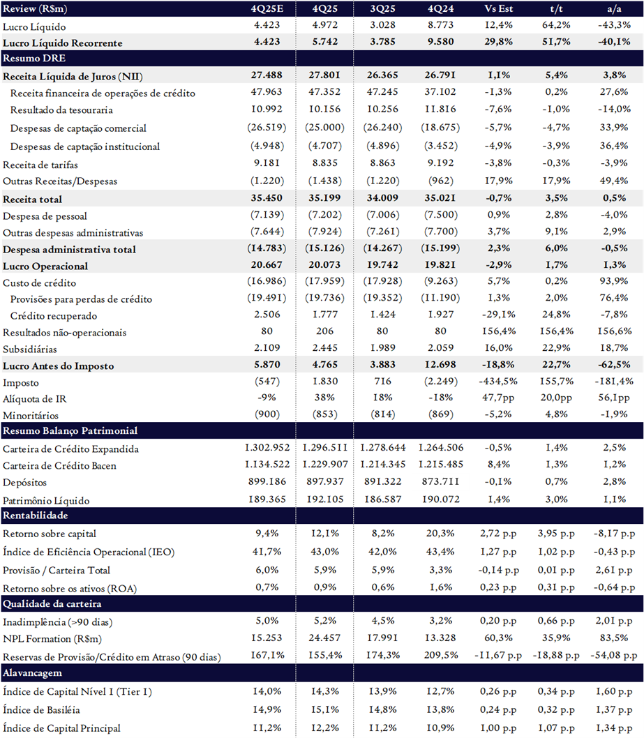 Apesar do lucro ter vindo substancialmente acima das expectativas, a qualidade do resultado permanece fragilizada. O lucro antes de impostos (LAIR) totalizou R$ 4,77b, queda de 62,5% a/a e 19% abaixo das nossas estimativas, evidenciando que o resultado final foi fortemente beneficiado por uma alíquota efetiva positiva de +38% (vs. +18% no 3T25 e -18 no 4T25), impulsionada pelo pagamento de R$ 1,5 bilhão em JCP e créditos tributários. Ajustando pelo benefício fiscal, o resultado operacional permanece pressionado pelo custo de crédito elevado (R$ 18 bi) e deterioração contínua do agronegócio.