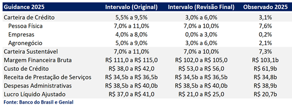 O BB revisou o guidance por 3 vezes ao longo de 2025, reforçando a falta de visibilidade do ciclo do crédito agrícola e introdução contábil regulatória. Em comparação a ultima revisão, o realizado veio próximo, mas alguns destaques negativos como expansão fraca do crédito e custo do crédito pressionado.
