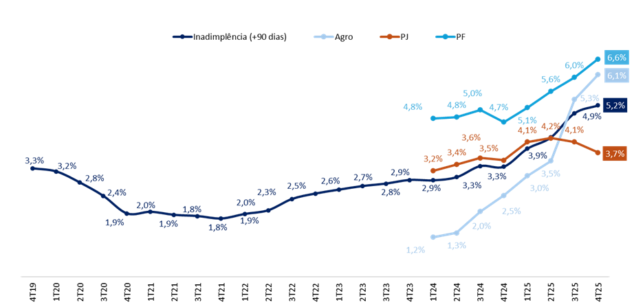 - Inadimplência no agronegócio: seguiu em forte trajetória de deterioração, atingindo 6,1% (vs. ~1% antes do ciclo piorar), com concentração nas cadeias de soja e milho na região Centro-Oeste. Embora não tenha ocorrido quebra relevante de safra, a queda acentuada dos preços e a elevada alavancagem dos produtores levaram a um aumento expressivo nos atrasos e pedidos de recuperação judicial.
