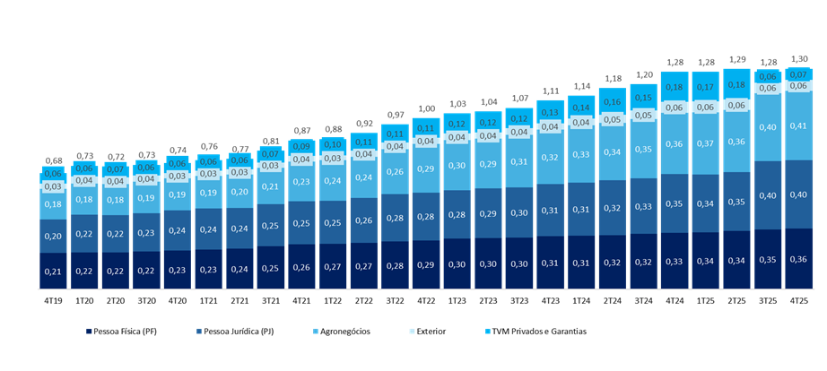 No 4T25, os índices de capital registraram avanço em relação ao trimestre anterior. O capital principal atingiu em 12,2% (+1,1 pp t/t e +1,3 pp a/a). O Índice de Basileia encerrou o período em 15,1% (+0,3 pp t/t e +1,4 pp a/a) e o capital Nível I (Tier 1) em 14,3% (+0,3 pp t/t e +1,6 pp a/a).