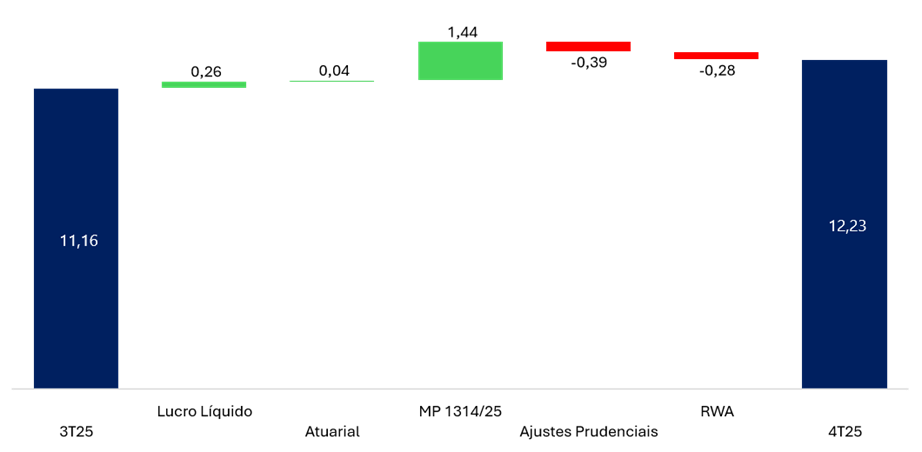 O avanço reflete o crescimento orgânico de capital no trimestre, combinado aos efeitos positivos da MP 1314/25, que resultou no benefício da dedução em crédito tributário das operações BB Regulariza Dívidas Agro e do Programa BNDES Liquidação de Dívidas Rurais, gerando impacto de +144bps no Capital Principal. Esses fatores foram parcialmente compensados pelos impactos negativos do aumento dos ativos ponderados pelo risco (RWA), além de ajustes prudenciais.