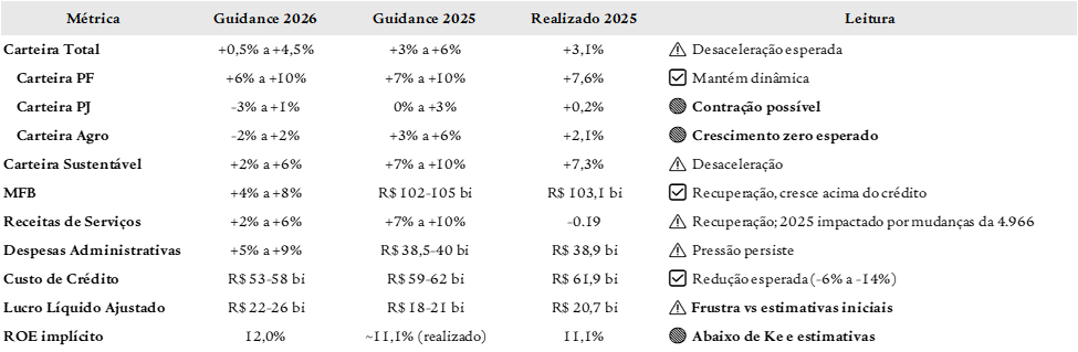 O guidance 2026 divulgado pelo banco aponta para lucro líquido ajustado de R$ 22-26 bilhões (ROE implícito de ~12% no meio do intervalo), representando crescimento de apenas +6% a +26% vs 2025 (R$ 20,7 bi).