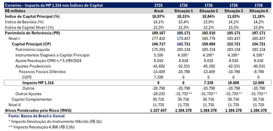 Como já havíamos antecipado em nosso relatório de prévia do 2T25 (vide relatório), o Banco do Brasil enfrentará em 2026 uma pressão adicional estimada em cerca de –105 bps no CET1, resultado do fim do programa do Programa de Capital de Giro para Preservação de Empresas (CGPE) ganhos durante a pandemia (–60 bps), do segundo ano de impacto da Resolução 4.966 (–25 bps), da devolução de instrumentos híbridos (–10 bps) e do aumento do risco operacional regulatório (–10 bps). O banco tem como meta interna manter o capital principal em 11%, patamar já atingido em 2025, e a MP 1.314 surge como instrumento para compensar essa pressão: caso consiga originar próximo ao limite de R$ 10 bilhões com recursos próprios, o BB deve conseguir neutralizar o impacto negativo e preservar sua meta de capital principal de 11%.