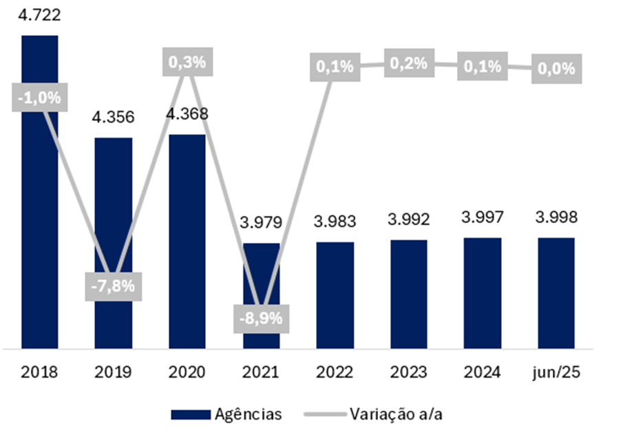 Apesar dos avanços na transformação digital e na racionalização da estrutura, o Banco do Brasil ainda apresenta evolução gradual em eficiência operacional. Desde 2022, tanto o número de funcionários quanto o de agências permanecem praticamente estável, totalizando 85,9 mil empregados e 3.998 unidades em junho de 2025. O ritmo de fechamento de agências e redução de headcount foi mais moderado nos últimos anos, especialmente quando comparado aos pares privados, refletindo uma estratégia de transição mais cautelosa.