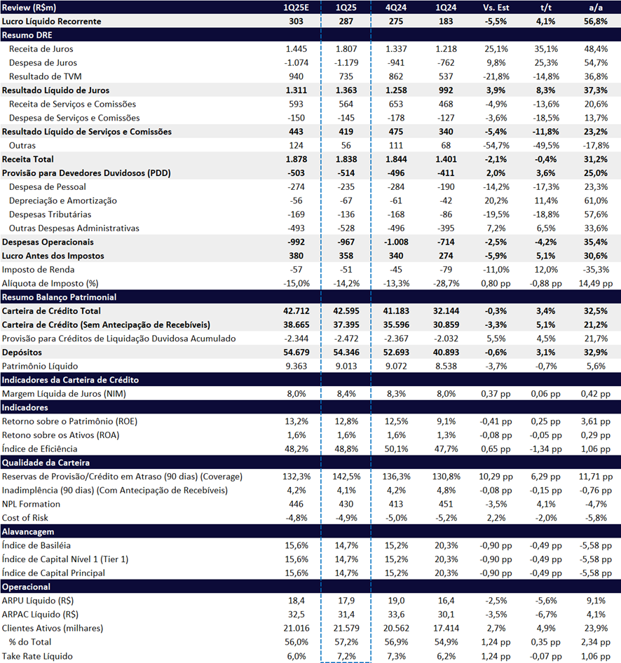 Por fim, destacamos o lançamento do consignado privado no fim de março, alcançando uma carteira de R$ 197 milhões em apenas 10 dias. O banco reforçou a oportunidade estratégica desse produto, dado seu perfil 100% digital, escalável e colateralizado, com baixo custo operacional e pouca sobreposição com outras linhas de crédito já oferecidas.