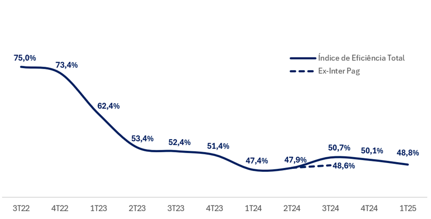 O índice de eficiência atingiu 48,8% no trimestre, com melhora de -1,3 pp t/t, reforçando a trajetória de melhora operacional do banco após a piora pontual registrada no 2T24 e 3T24, quando os custos foram pressionados por investimentos e pela incorporação da InterPag.
