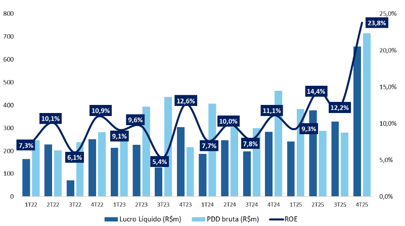 As despesas de provisão líquidas de recuperações (PDD) totalizaram R$ 585 milhões no 4T25, com forte alta de +205,5% t/t e +213,8% a/a. A volatilidade do trimestre foi explicada, principalmente, pela constituição de um reforço de provisão de R$ 257,0 milhões, relacionado a uma dação em pagamento recebida na liquidação de crédito junto a empresas. O ativo recebido — atualmente classificado como depósito judicial — passou a exigir provisão integral diante da elevação do risco associado.