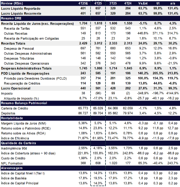 - NII: Leve alta de +0,7% t/t e +4,2% a/a atingindo R$ 1,62 bilhão no 4T25, refletindo crescimento da carteira e o maior volume de aplicações em tesouraria; apesar disso, a NIM recuou 0,1 pp t/t, para 5,0%, pressionada pelo custo de funding em ambiente de Selic elevada.