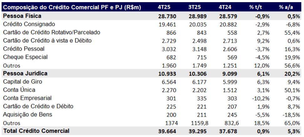 - Consignado: Houve uma contração de -2,9% t/t e -6,8% a/a. Interpretamos essa redução como um movimento tático de desalavancagem em uma linha de margens comprimidas por tetos regulatórios e concorrência acirrada.
