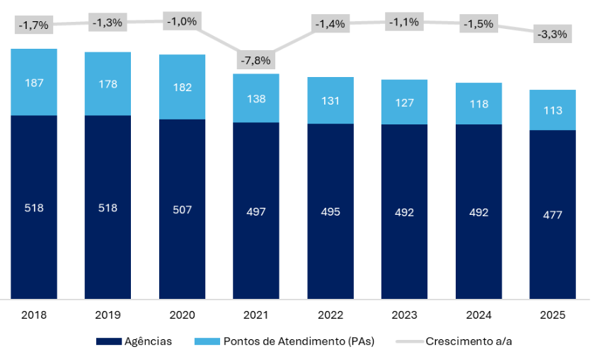 As despesas administrativas totalizaram R$ 1,9 bilhão no 4T25 (+8,9% t/t; +1,1% a/a), impulsionadas por remuneração variável (participação nos lucros +37,7% t/t) e despesas de pessoal (+8,5% t/t), típicas de sazonalidade no 4T. Anualmente, o avanço foi moderado (+5,2% no consolidado 2025), puxado por salários (+12,1% a/a) e amortização/depreciação (+27,1% a/a), parcialmente offset por queda em aluguéis/condomínios (-69,3% a/a) via reclassificações contábeis normativas e otimização de rede.
