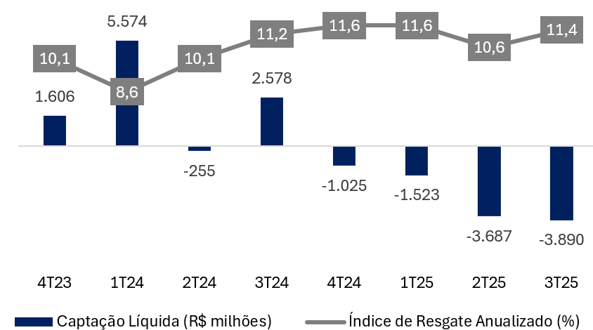 Por outro lado, as contribuições brutas de previdência recuaram -18,9% a/a,apesar de alta de +36,0% na comparação trimestral, totalizando R$ 13,3 bilhões. O desempenho anual foi pressionado pelo impacto negativo refletindo os efeitos do Decreto 12.499, que impôs o teto da isenção para aportes anuais de até R$ 300 mil em 2025 e R$ 600 mil a partir de 2026. Somando-se ao aumento de +0,2 pp a/a no índice de resgate para 11,4% e expansão de +1,8 pp a/a no índice de portabilidade para 3,5%, a resgate líquida piorou, totalizando -R$ 3,89 bilhões em comparação com captação liquida de +R$ 2,57 bilhões.