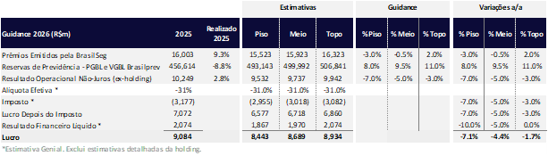 Apesar do crescimento de lucro de 11,4% para 2025, projetamos um ritmo mais moderado em 2026. O guidance, segundo nossas estimativas, aponta para uma queda de -4,4% a/a, Refletindo a provável queda da Selic, o que reduzir o resultado financeiro, baixo crescimento de prêmios, decrescimento do resultado operacional (não-juros).