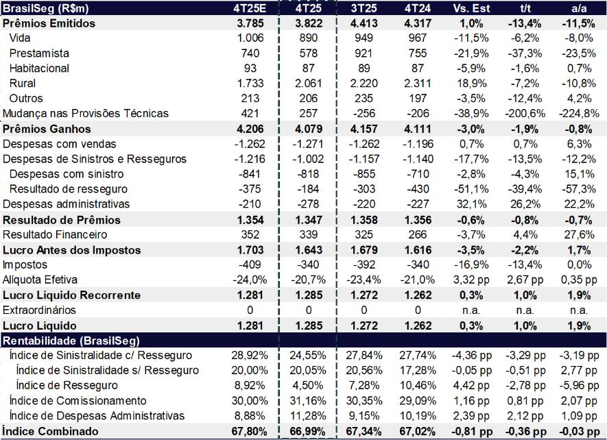 BrasilSeg (Seguros). Na unidade de seguros, o resultado financeiro voltou a ser o principal sustentáculo do lucro, mais do que compensando o fraco desempenho comercial. O resultado financeiro cresceu +4,4% t/t e +27,6% a/a, alcançando R$ 339 milhões no trimestre. Por outro lado, os prêmios emitidos recuaram –11,5% a/a, encerrando 2025 –8,8% abaixo do guidance (intervalo de –4% a +1%). O lucro líquido recorrente da unidade totalizou R$ 1,29 bilhão, alta modesta de +1,0% t/t e +1,9% a/a.