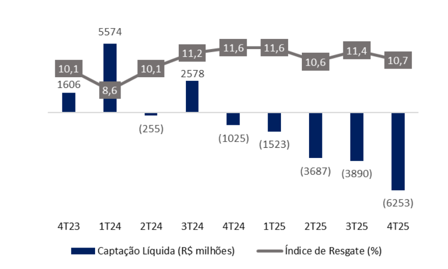 A captação líquida permaneceu negativa em -R$ 6,3 bilhões no trimestre, refletindo a queda de 36,6% a/a nas contribuições de previdência, impactadas por mudanças regulatórias e menor atratividade relativa dos produtos. O índice de resgate avançou para 11,4% (+0,2 pp t/t), enquanto o índice de portabilidade subiu para 3,5%, reforçando um ambiente competitivo mais intenso e pressionando o fluxo líquido de recursos no trimestre.