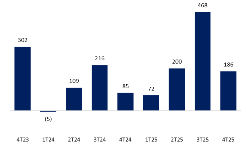 O resultado financeiro líquido consolidado somou R$ 577 milhões, forte alta de +80,9% a/a, representando 25,2% do lucro total da companhia. Ainda assim, o desempenho ficou abaixo do nível excepcional observado no 3T25 (R$ 714 milhões), indicando normalização sequencial.