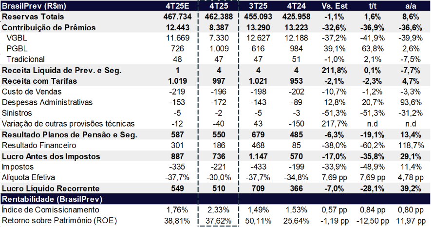 Brasilprev (Previdência). A Brasilprev reportou lucro líquido de R$ 510 milhões, com queda de –28% t/t e alta de +39% a/a, ainda beneficiada pelo forte resultado financeiro. A retração sequencial reflete a base excepcionalmente elevada do 3T25.
