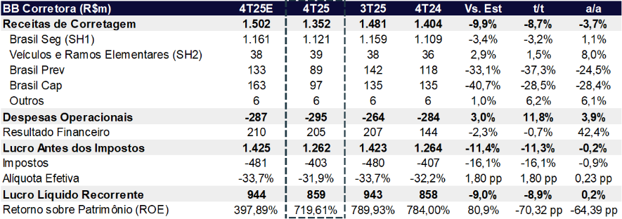 No 4T25, a BB Corretora registrou lucro líquido de R$ 859 milhões, leve alta de +0,2% a/a, mas um queda -8.9% t/t, devido as receitas mais fracas de corretagem, parcialmente mitigada pelo resultado financeiro