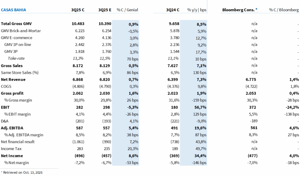 Tabela 1: Comparação entre o resultado consolidado pela Casas Bahia e a expectativa Genial (IFRS 16; R$ milhões).