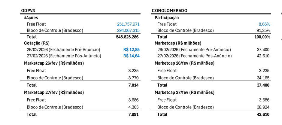 - Com base nas informações divulgadas, a relação de troca implica que os minoritários da Odontoprev deterão 8,65% do conglomerado.