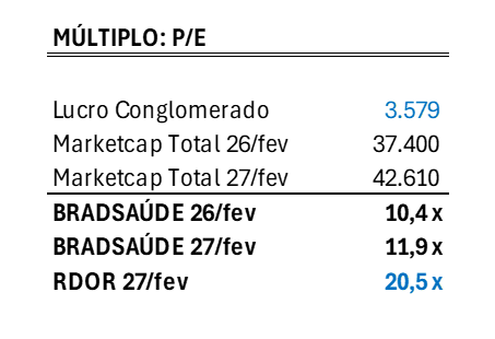 - Com base no novo market cap estimado do conglomerado e no lucro líquido divulgado de R$ 3,6 bilhões, estimamos o P/L implícito da BradSaúde em 10,4x considerando a cotação de fechamento pré-anúncio. Com a cotação de fechamento pós-anúncio, o múltiplo subiria para 11,9x.