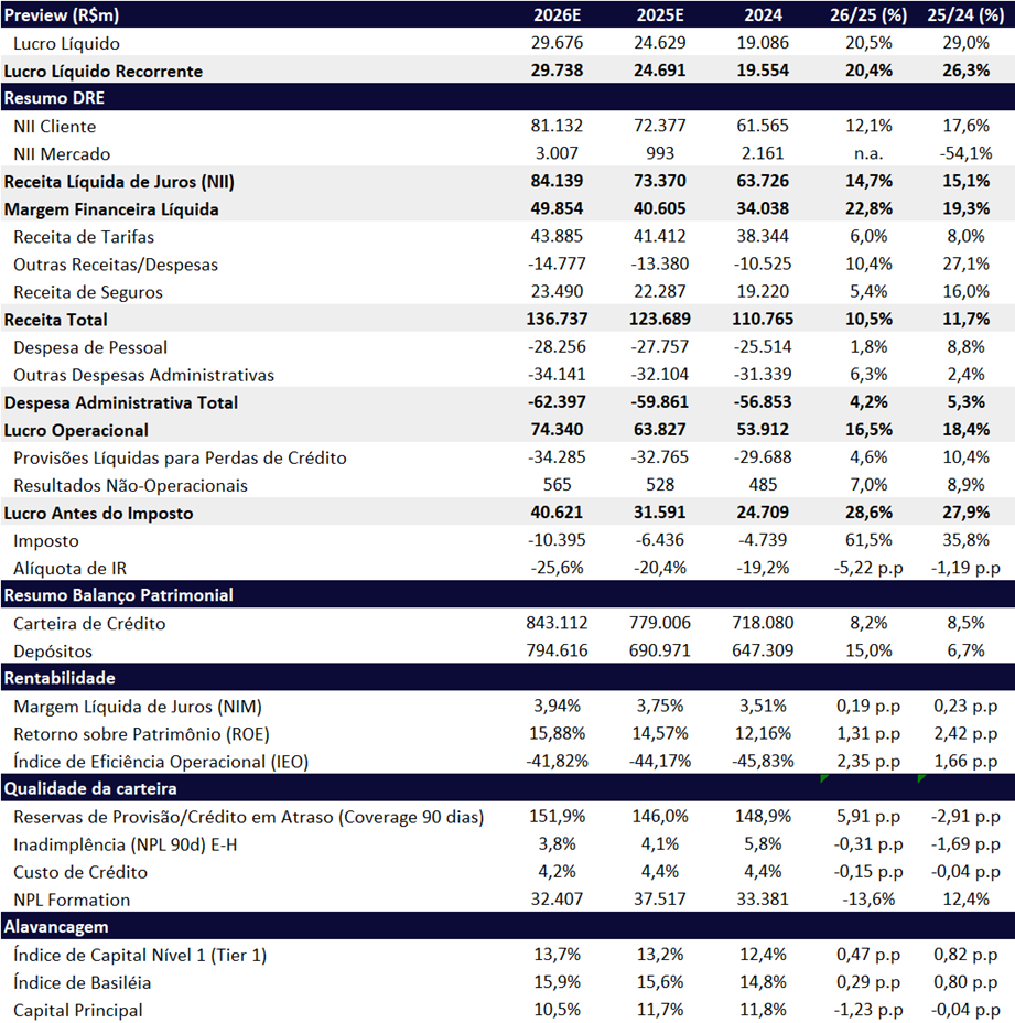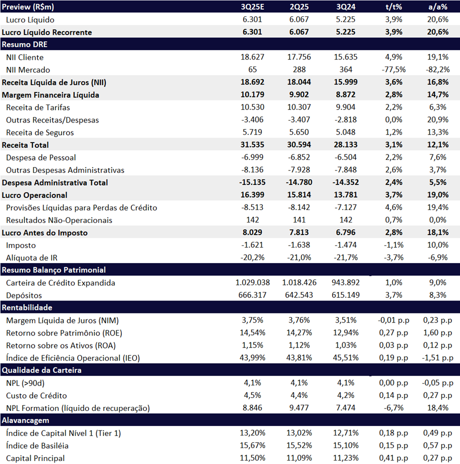- Carteira de crédito: deve atingir R$ 1,03 trilhão (+1,0% t/t; +9,0% a/a). O crescimento anual segue impulsionado por Pessoa Física (PF) e Pequenas e Médias Empresas (PMEs), principalmente em linhas com garantia, mas a desaceleração t/t reflete maior seletividade na originação.