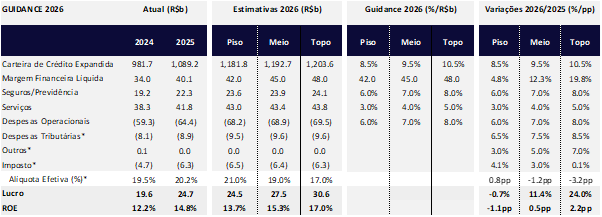 - Carteira de Crédito: crescimento entre 8,5% e 10,5%, refletindo ganho de market share em 2026.