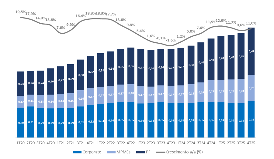 A carteira de crédito expandida alcançou R$ 1,09 trilhão (+5,3% t/t; +11,0% a/a), com crescimento concentrado em Pessoa Física (R$ 466,5 bilhões; +12,7% a/a) e PMEs, refletindo o foco em linhas de maior qualidade, maior uso de garantias e melhor retorno ajustado ao risco.
