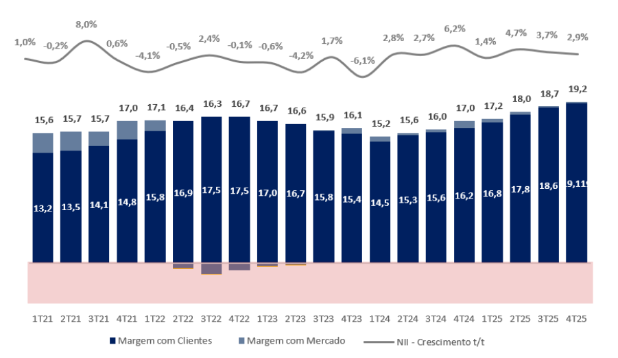 No 4T25, o principal motor do resultado continuou sendo a Margem Financeira com Clientes (NII Clientes), que atingiu R$ 18,7 bilhões, novo recorde histórico, com alta de +3,7% t/t e +16,9% a/a. O desempenho foi sustentado por melhor mix de crédito, maior eficiência no funding e efeito positivo do maior número de dias úteis, mais do que compensando a fraqueza persistente da margem com mercado e reforçando a recuperação estrutural das receitas.