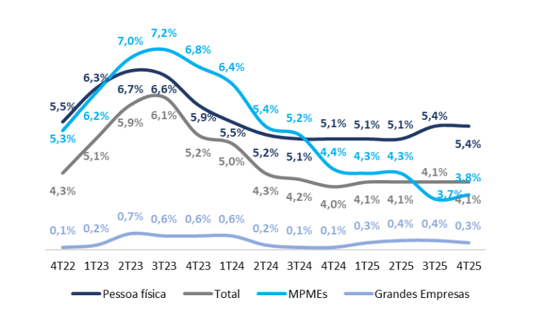 No detalhe por segmento, vemos uma marginal piora no desempenho da carteira MPMEs, cuja inadimplência aumentou de 3,7% no 3T25 para 3,8% no 4T25, após um longo ciclo de melhora. Em contrapartida, a inadimplência de Pessoa Física ficou estagnada em 5,4%, ainda impactada por linhas sem garantia, mas sem sinais de deterioração relevante.