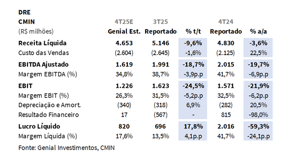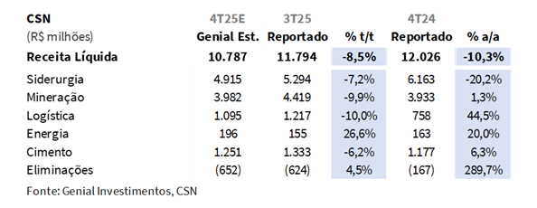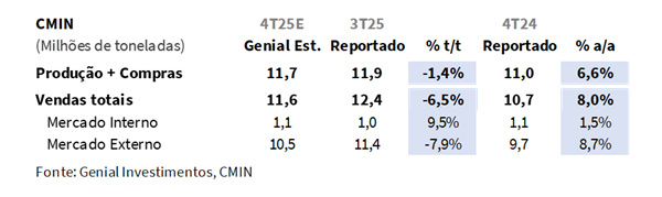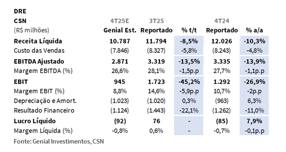 A companhia deve reportar Receita Líquida de R$10,8b Genial Est. (-8,5% t/t; -10,3% a/a), com a contração sequencial explicada principalmente pelo desempenho mais fraco nas divisões de aço e mineração, que juntas devem responder pela maior parte da receita consolidada (~82%). Em mineração, estimamos R$4,0b Genial Est. (-9,9% t/t; +1,3% a/a), com a queda sequencial explicada sobretudo pela redução dos preços realizados — após a ausência do efeito positivo extraordinário de pricing provisório visto no 3T25 — e pela redução t/t dos embarques, apesar de ainda permanecerem em níveis fortes acima de 11Mt.