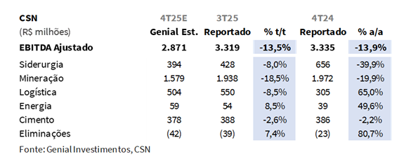 Projetamos EBITDA consolidado de R$2,9b Genial Est. (-13,5% t/t; -13,9% a/a), com a contração trimestral sendo principalmente explicada pela normalização da rentabilidade da mineração e por resultados mais fracos na divisão de aço, além da moderação sazonal em logística e cimento. O EBITDA de mineração deve atingir R$1,6b Genial Est. (-18,5% t/t; -19,9% a/a), refletindo sobretudo a ausência do efeito extraordinariamente favorável de precificação provisória registrado no 3T25, combinada a embarques ligeiramente menores, apesar de volumes ainda robustos acima de 11Mt.