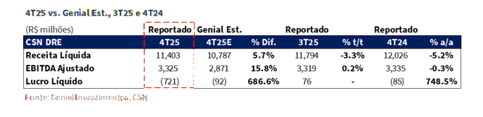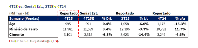 A CSN Holding reportou resultados operacionais acima do esperado, com Receita Líquida consolidada de R$11.4b (+5,7% vs. Est.), recuando -3,3% t/t e -5,2% a/a, superando nossa projeção inicial apesar da sazonalidade típica de fim de ano na divisão de aço e do início do período chuvoso (impactando tanto mineração quanto cimento). Acreditamos que essa melhora em relação ao esperado se deve principalmente à divisão de aço, que registrou receita de R$5.2b (+6,5% vs. Est.), ainda assim recuando -1,2% t/t e -15,2% a/a.