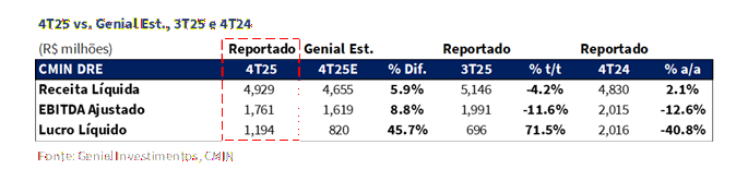 A CMIN reportou resultados operacionais sólidos, com Receita Líquida de R$4.9b (+5,9% vs. Est.), acima da nossa estimativa, recuando -4,2% t/t, mas avançando +2,1% a/a, principalmente explicado por volumes acima da nossa projeção. Os embarques totalizaram 12,0Mt (+3,4% vs. Est.), caindo -3,3% t/t, mas expandindo +11,7% a/a, marcando o melhor desempenho de 4T da história da companhia, sustentado pela confiabilidade operacional nas minas e pela eficiência contínua da plataforma logística, particularmente via TECAR.