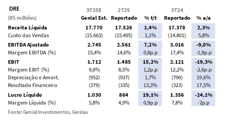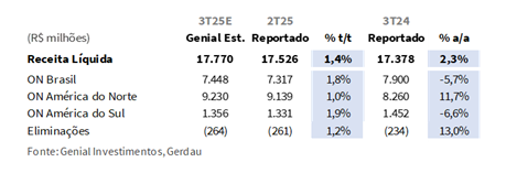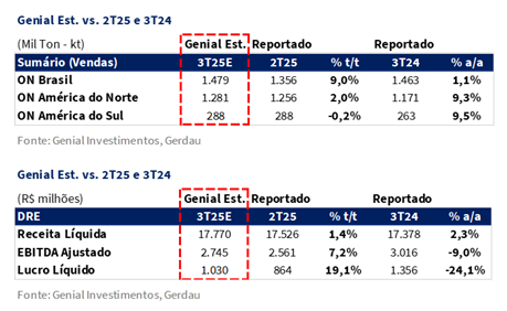 (i) ON Brasil: Embarques totais em 1.479Kt Genial Est. (+9,0% t/t; +1,1% a/a), impulsionados pela retomada de Ouro Branco (+120–150Kt) e ramp-up da BQ2; MD em 1.177Kt Genial Est. (+1,2% t/t; -2,6% a/a), com maior autossuficiência em planos e defesa de market share; ME em 301Kt Genial Est. (+55,7% t/t; +18,4% a/a), voltando ao nível histórico; o preço realizado deve cair para R$5.038/t (-6,6% t/t), pressionado por concorrência e mix exportador mais simples; COGS/t deve recuar para R$4.734/t Est. (-5,5% t/t; +5,7% a/a), com diluição de custos fixos e maior eficiência fabril;(ii) ON América do Norte: Embarques estáveis em 1.281Kt Genial Est. (+2,0% t/t; +9,3% a/a), com demanda firme e orderbook robusto (~70 dias); preço realizado deve atingir R$7.208/t (-1,0% t/t), sustentado por mix mais nobre e reajustes em USD; COGS/t recua para R$6.027/t Est. (-2,3% t/t; -2,3% a/a), favorecido por apreciação cambial (-4% t/t) e verticalização da sucata (~40% cativa); (iii) ON América do Sul: Embarques em 288Kt Genial Est. (-0,2% t/t; +9,5% a/a), com estabilidade da demanda regional, puxada pelo Peru; preço realizado deve subir para R$4.711/t (+2,1% t/t; -14,7% a/a), com melhora do mix doméstico; (iv) Receita Líquida Consolidada de R$17,8b Genial Est. (+1,4% t/t; +2,3% a/a), puxada por ON Brasil e ON América do Norte; No Brasil, R$7,5b (+1,8% t/t; -5,7% a/a), com recomposição de volumes; na América do Norte, R$9,2b (+1,0% t/t; +11,7% a/a), com mix mais qualificado compensando o câmbio; (v) EBITDA Consolidado de R$2,7b Genial Est. (+7,2% t/t; -9,0% a/a), sustentado pela ON América do Norte (+12% t/t; +44% a/a), compensando a compressão da ON Brasil (-12% t/t;-50% a/a); margem de 15,4% (+0,8p.p. t/t; -1,9p.p. a/a); (vi) Lucro Líquido de R$1,0b Genial Est. (+19,1% t/t; -24,1% a/a), apoiado por maior EBIT (+15,2% t/t) e eficiência operacional sequencial; Queda a/a deve refletir tanto a queda de EBIT (-19% a/a) quanto maior despesa financeira (+17,5% a/a) com SELIC a 15%; (vii) Reiteramos nossa recomendação de COMPRA para a companhia, com reajuste de Target Price 12M para R$21,50 (vs. R$20,50 anteriormente), implicando em um upside de +17,5%.