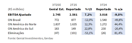 Acreditamos que o EBITDA ajustado consolidado da companhia atinja R$2,7b (+7,2% t/t; -9,0% a/a), apresentando alta sequencial, mas ainda queda anual. Na leitura t/t, o desempenho deve ser impulsionado principalmente pela ON América do Norte, cuja operação está projetada para registrar EBITDA de R$1,8b (+12,3% t/t; +44,4% a/a), com ganhos de eficiência fabril e redução do COGS/t em BRL, além do maior volume processado e mix mais nobre de produtos.