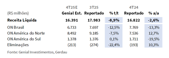 Projetamos que a Receita Líquida consolidada alcance R$16,4b Genial Est. (-8,9% t/t; -2,6% a/a), refletindo uma queda sequencial explicada principalmente por volumes mais fracos na ON Brasil e na ON América do Norte, além de preços mais baixos no mercado brasileiro. Na base trimestral, a contração deve ser explicada quase integralmente pela ON Brasil, onde a receita é estimada em R$6,7b Est. (-12,5% t/t; -13,3% a/a), refletindo a sazonalidade típica do 4T, com (i) desaceleração da demanda doméstica, (ii) estoques mais elevados ao longo da cadeia e (iii) deterioração de mix decorrente de maior direcionamento de volumes para exportação, com menores realizações de preço.