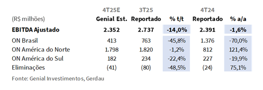 Esperamos que o EBITDA ajustado consolidado alcance R$2,4b Genial Est. (-14,0% t/t; -1,6% a/a), refletindo uma contração sequencial explicada principalmente pelas condições operacionais mais fracas na ON Brasil, apenas parcialmente compensadas pela resiliência da ON América do Norte. Na base trimestral, o desempenho do EBITDA deve continuar ancorado na ON América do Norte, que projetamos entregar R$1,8b Genial Est. (-1,2% t/t; +121,4% a/a), sustentado por volumes estruturalmente mais elevados, níveis robustos de backlog e um ambiente favorável de metal spreads, apesar da desaceleração sazonal nos embarques no 4T.