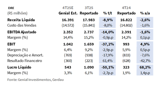 (i) ON Brasil: Embarques totais de 1.423Kt Est. (-10,1% t/t; -0,4% a/a), refletindo sazonalidade doméstica negativa no 4T, atividade automotiva mais fraca e níveis elevados de estoques, parcialmente compensados por maior alocação para exportações; preço realizado projetado em R$4.732/t Est. (-2,7% t/t), pressionado pela deterioração de mix, à medida que produtos de maior valor agregado do MD foram substituídos por exportações de semiacabados; COGS/t esperado em R$4.642/t Est. (+0,7% t/t; +1,8% a/a), pressionado por paradas de manutenção, custos de hibernação de usinas e alta dos preços do carvão metalúrgico; (ii) ON América do Norte: Embarques de 1.190Kt Est. (-8,0% t/t; +11,0% a/a), refletindo a sazonalidade típica do 4T após um 3T muito forte, enquanto a demanda permanece firme, com backlogs ~80 dias e menor penetração de importações; preço realizado estimado em R$7.138/t Est. (+0,5% t/t), praticamente estável em termos de BRL, sustentado pelo carry-over em USD, parcialmente compensado por mix mais fraco em aços especiais automotivos; COGS/t projetado em R$5.837/t Est. (-1,2% t/t; -10,2% a/a), beneficiado pelo câmbio (-1% t/t) e por preços mais baixos de sucata; (iii) ON América do Sul: Embarques de 290Kt Est. (+0,3% t/t; +6,9% a/a), refletindo demanda regional estável, liderada pelo Peru, enquanto a Argentina segue fraca; preço realizado projetado em R$4.755/t Est. (-0,2% t/t), praticamente estável na comparação sequencial; margens pressionadas por custos mais elevados associados a paradas de manutenção, especialmente na Argentina; (iv) Receita Líquida estimada em R$16,4b Est. (-8,9% t/t; -2,6% a/a), pressionada por volumes e preços mais fracos no Brasil e pela desaceleração sazonal na América do Norte; (v) EBITDA de R$2,4b Est. (-14,0% t/t; -1,6% a/a), pressionado por ON Brasil, parcialmente compensado pela resiliência da ON América do Norte; (vi) Lucro Líquido em R$543m Est. (-50,1% t/t; +68,2% a/a), refletindo forte contração sequencial, explicada por EBIT mais fraco e maiores despesas financeiras líquidas, amplificadas pela valorização do USD/BRL EOP (+3% t/t); (vii) Reforçamos que o rali recente já absorveu grande parte do upside e, por mais que nosso Target Price 12M tenha sidomantido em R$21,50, decidimos por rebaixar nossa recomendação para MANTER (vs. COMPRAR anteriormente), implicando em um downside de -2%, ressaltando, contudo, que não houve deterioração da tese de investimento, mas sim sua materialização já refletida no preço das ações.
