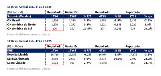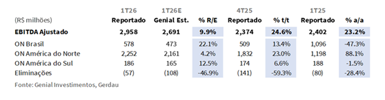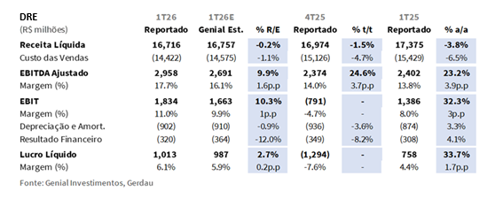 A Gerdau divulgou seus resultados do 1T26 ontem, 27/abr, após o fechamento do mercado. Nos números consolidados, a Receita Líquida atingiu R$16,7b (-0,2% vs. Est.; -1,5% t/t; -3,8% a/a), amplamente em linha com nossas estimativas. O EBITDA Aj. registrou R$3,0b (+9,9% vs. Est.; +24,6% t/t; +23,2% a/a), vindo claramente acima das nossas projeções e do consenso (+5,2% vs. Consenso BBG), com a margem avançando para 17,7% (+1,6p.p. vs. Est.; +3,7p.p. t/t; +3,9p.p. a/a), a leitura trimestral mais forte desde o 3T23. A superação foi ampla, com surpresas positivas em todas as três divisões, embora os vetores fossem assimétricos: a ON América do Norte entregou na recuperação de volume, backlogs recordes e expansão do spread de metal, enquanto a ON Brasil surpreendeu no alívio do COGS/t, e não na precificação, que permaneceu sob pressão ao longo do trimestre.