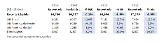 A Receita Líquida consolidada totalizou R$16,7b (-0,2% vs. Genial Est.), recuando -1,5% t/t e -3,8% a/a, vindo em linha com nossas estimativas, à medida que a entrega em linha da América do Norte e a surpresa positiva da América do Sul compensaram amplamente o shortfall do Brasil. A ON Brasil foi o principal arrasto, com receita registrando R$6,3b (-2,0% vs. Genial Est.), contraindo -12,7% t/t e -16,3% a/a, abaixo das nossas projeções, à medida que a combinação de menores volumes domésticos em jan-fev, a redução na alocação de exportações e a ausência de qualquer repasse significativo de preços durante o trimestre mais do que compensaram qualquer suporte residual do mix.