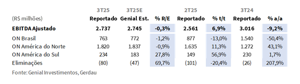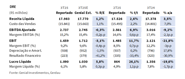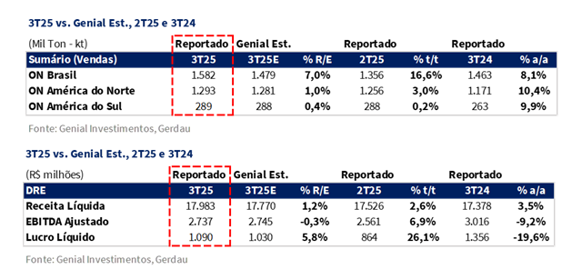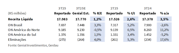 A Gerdau divulgou seus resultados do 3T25 no dia 30 de Out, após o fechamento do mercado. Nos números consolidados, A Receita Líquida alcançou R$18b (+1,2% vs. Est.; +2,6% t/t; +3,5% a/a) e o EBITDA foi entregue em R$2,7b (-0,3% vs. Est.; +6,9% t/t; ), em linha com o esperado, com uma narrativa geral próxima do que já havíamos comentado em publicações anteriores, diante da força motriz da ON América do Norte mais do que compensando o cenário adverso da ON Brasil. Ainda assim, vale mencionar que, os (i) destaques positivos foram os embarques e (ii) o COGSt/t com mais eficiência do que o antecipado, equilibrando (iii) preços realizados abaixo do esperado, tudo isso em ambas as divisões.